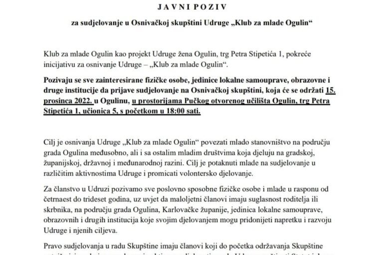 [JAVNI POZIV – Osnivačka skupština Udruge Klub za mlade Ogulin]
